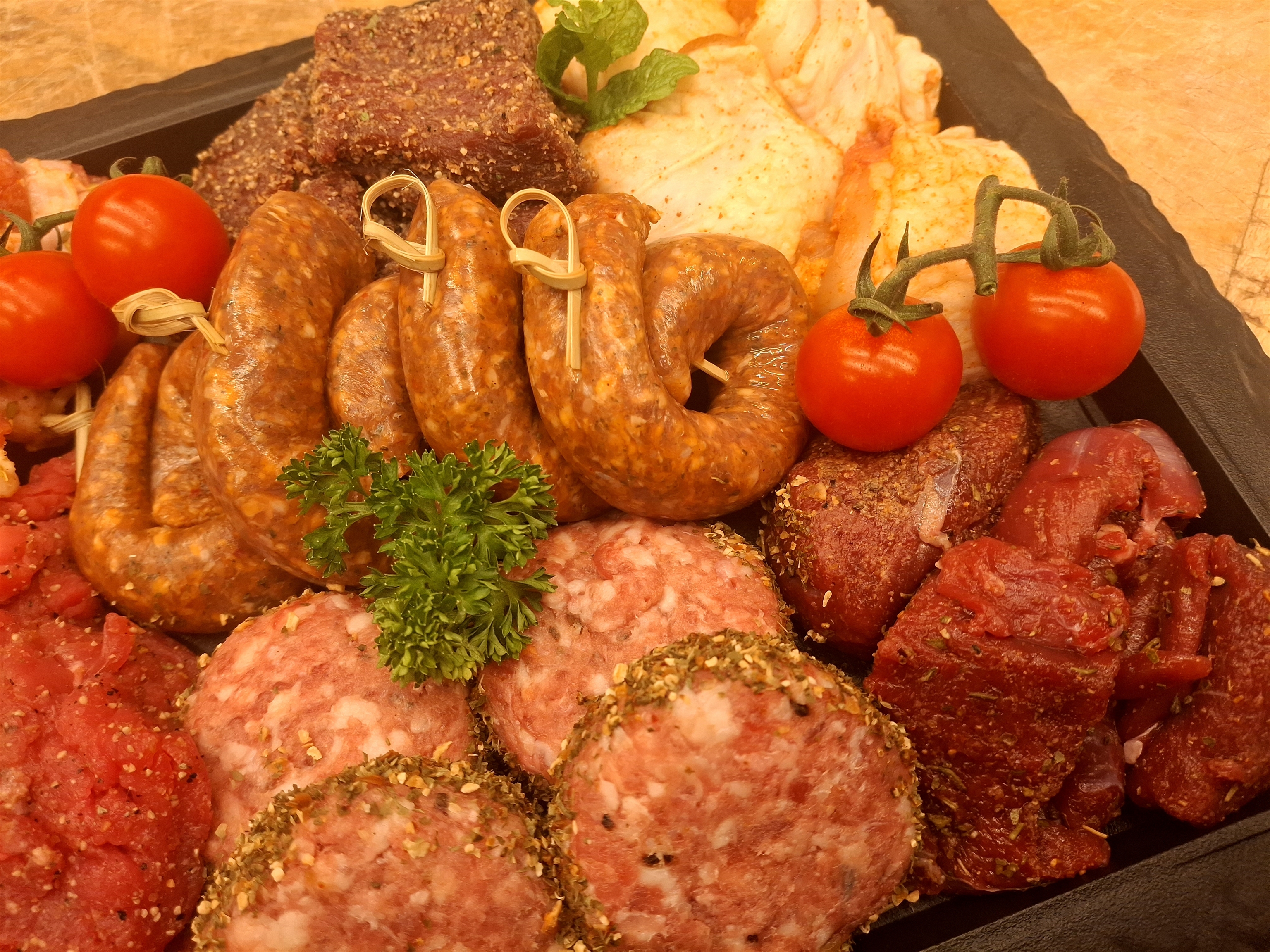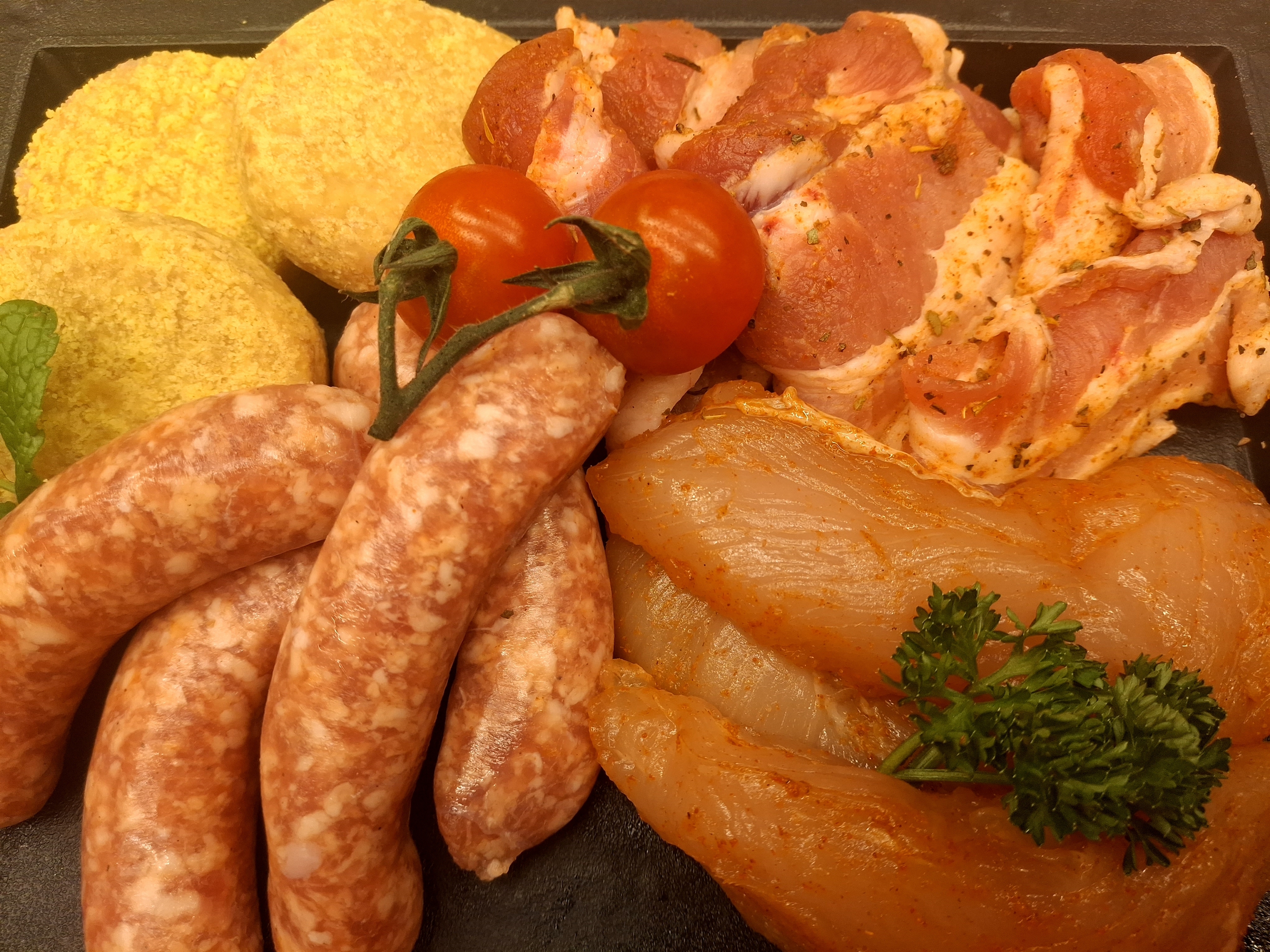 Deze gourmett omvat een kaasburgertje, chipolata, speklapje en kipfilet.